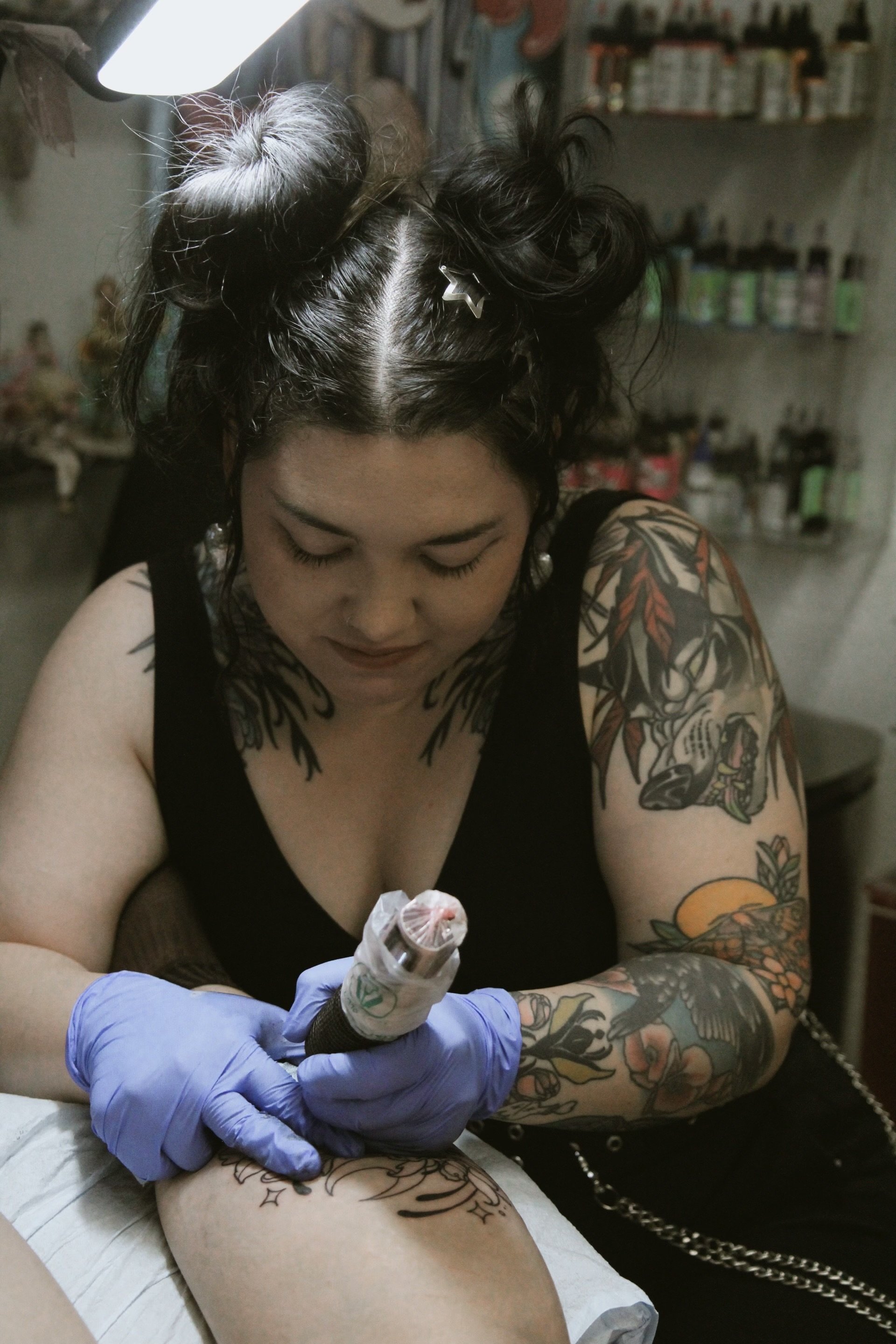 Jessie specializes in vibrant color work inspired by anime, video games, and pop culture. She loves collaborating with clients to bring their unique concepts to life- whether it’s a nostalgic character piece or a fully custom design rooted in your story. Jessie pulls artistic influence from worlds like Final Fantasy, NieR, NANA, Sanrio, The Apothecary Diaries, Gundam, as well as mythology and folklore.